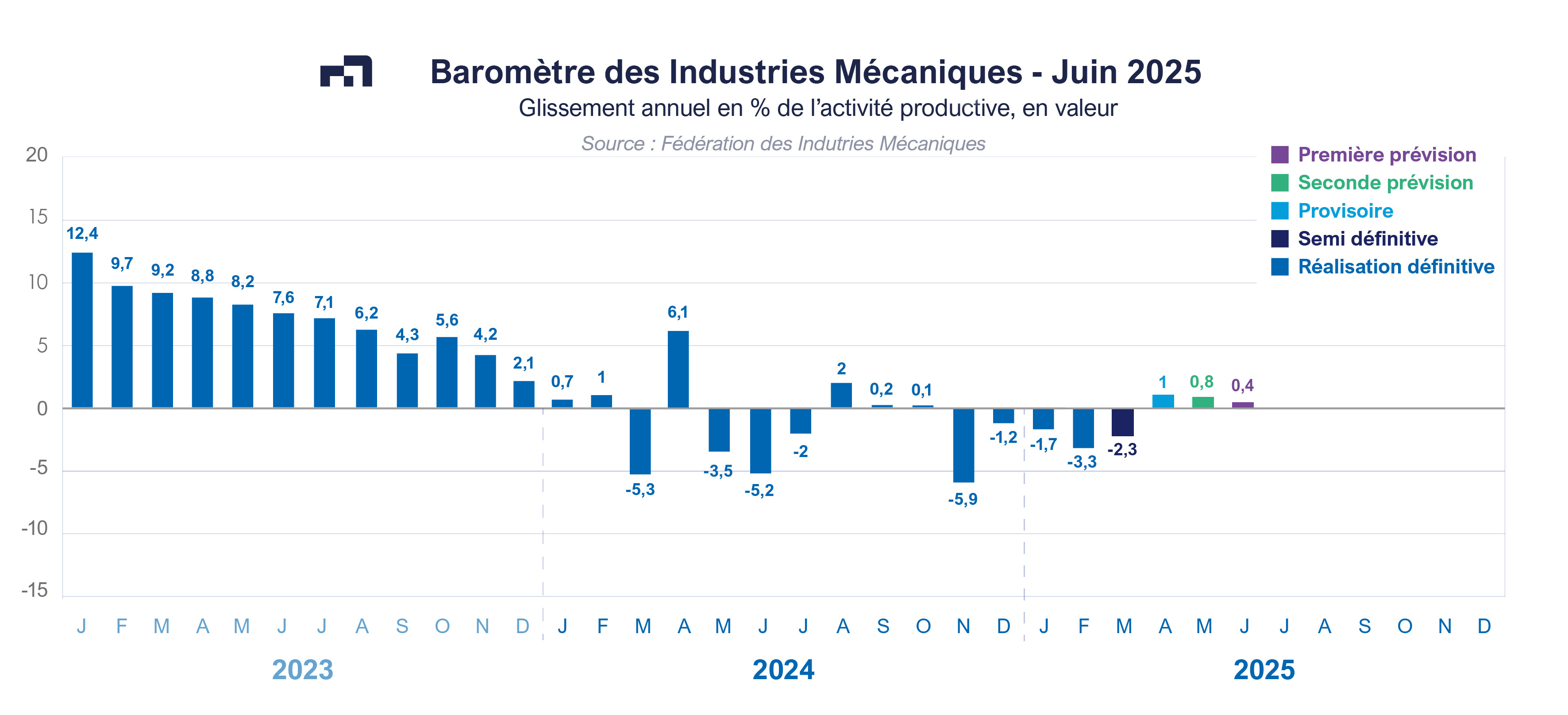 Au total, les facturations des industries mécaniques sont en baisse de – 2,2 % en valeur et en glissement annuel au premier trimestre de 2025. En outre, les opinions des industriels qui participent à l’enquête de conjoncture d’avril 2025 réalisée par la FIM s’améliorent. Cette évolution est en phase avec celle du climat des affaires publié par l’Insee au mois d’avril 2025 qui fait apparaître un rebond très net du climat dans l’industrie. L’environnement économique lié au marché intérieur se redresse ainsi, alors que des incertitudes persistent à l’international.