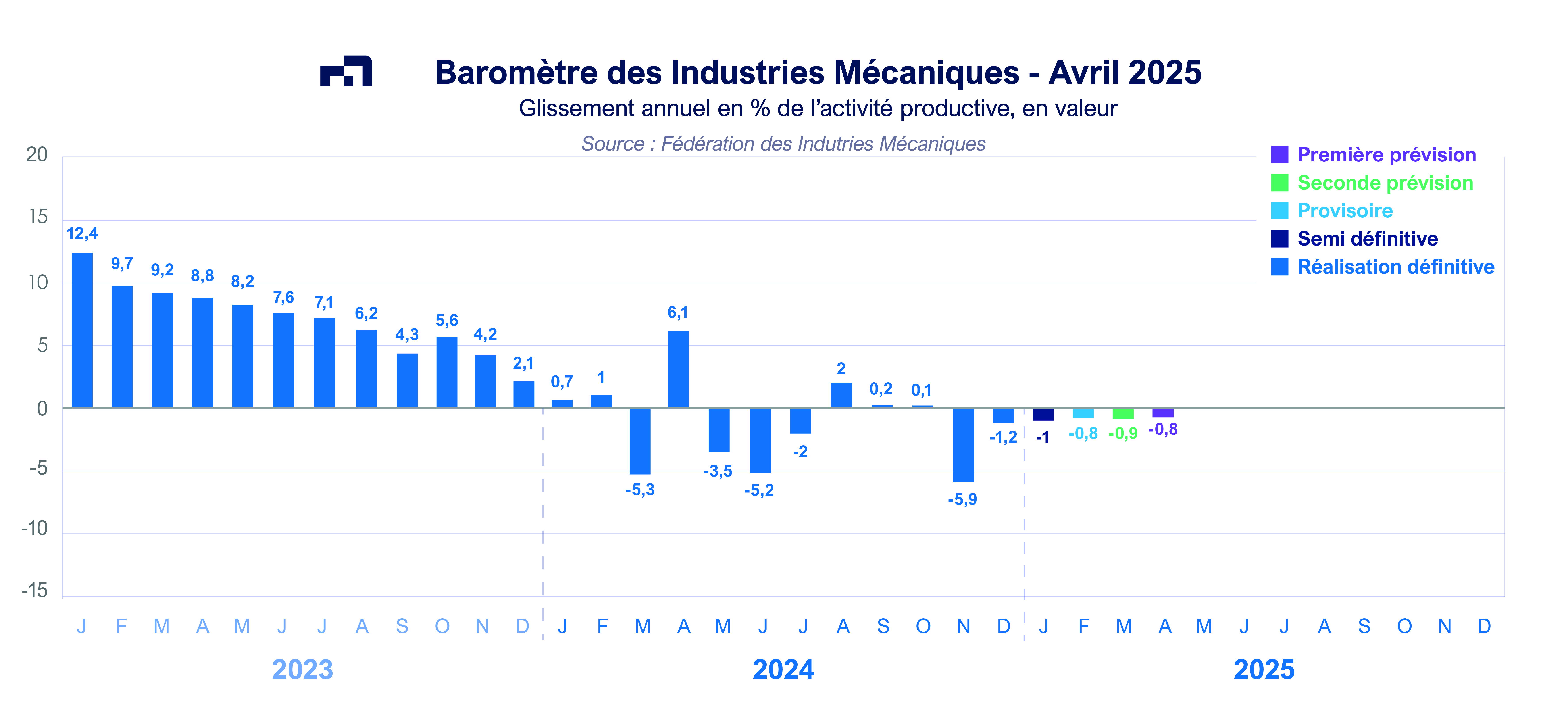 Au total, les facturations des industries mécaniques ont légèrement reculé en 2024 (- 1,1 %). Le chiffre d’affaires des industries mécaniques, après avoir fortement augmenté durant les trois années précédentes, évolue ainsi sur un haut plateau. Par ailleurs, l’agrégation des prévisions des professions mécaniciennes pour 2025 correspond à une stabilisation. Il est toutefois à noter que les prévisions de dépenses d’investissement retenues par les macroéconomistes sont défavorables en 2025.