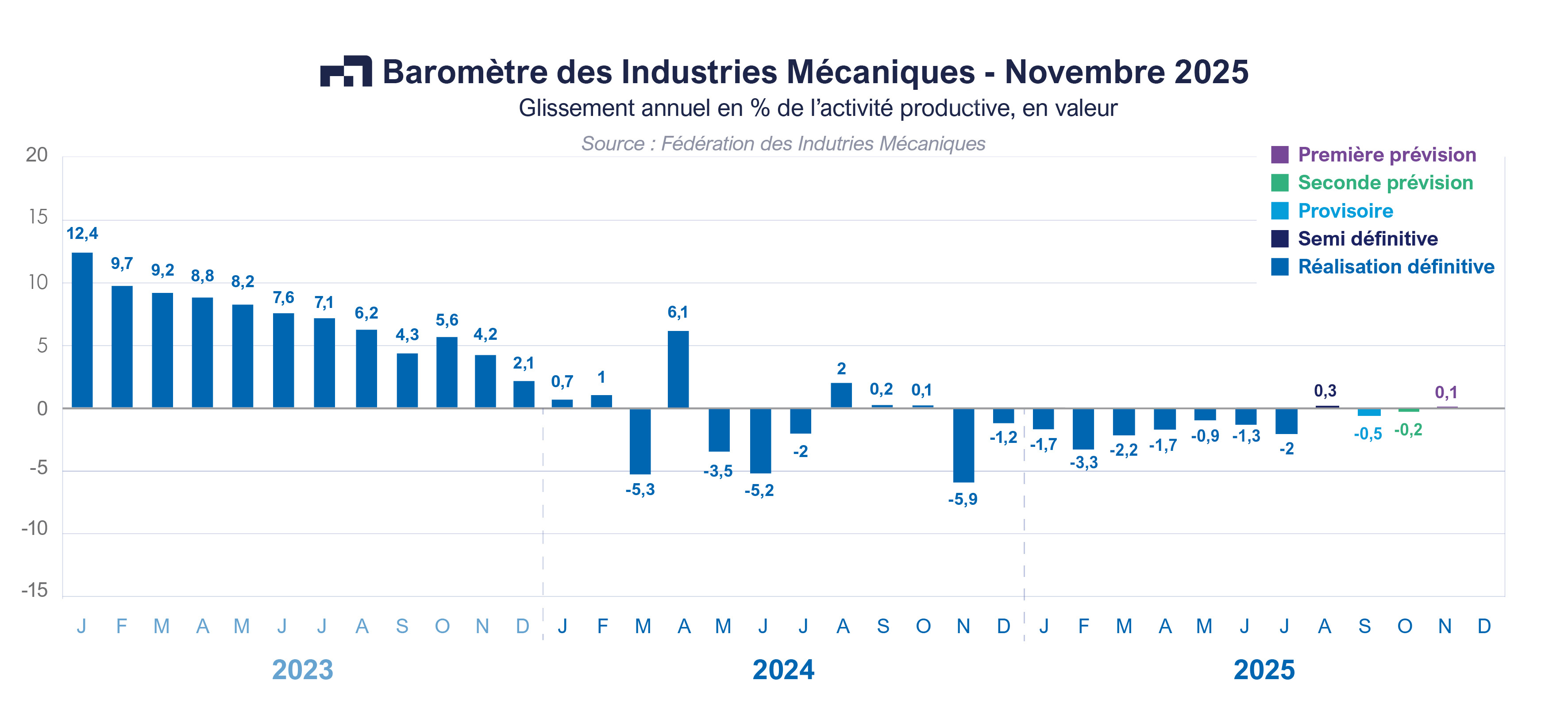 Au total, après une baisse de – 1,1 % en 2024, les facturations des industries mécaniques devraient encore se contracter cette année : - 1,2 % pour les onze mois de 2025 selon les premières estimations du baromètre des industries mécaniques. Cette baisse s’explique par la diminution de la formation brute de capital fixe en France, estimée à - 0,8 % pour l’ensemble de l’année 2025. En outre, les exportations de la France vers le reste du monde, tous secteurs confondus, ne devraient pas être dynamiques en 2025 (- 0,1 %).